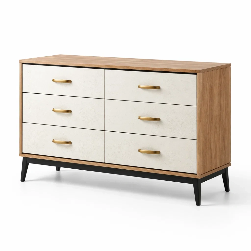 Cassettiera rettangolare in mdf e legno con sei cassetti beige e marrone chiaro