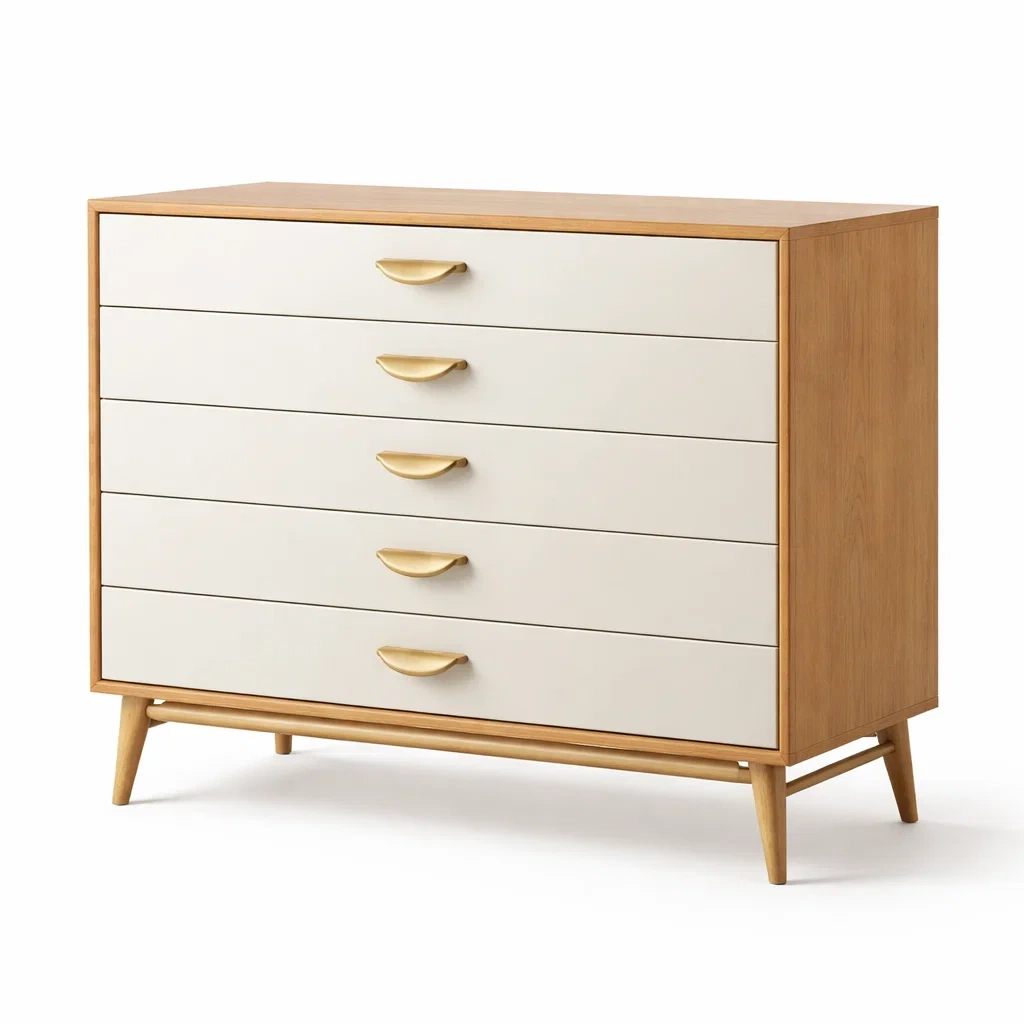 Cassettiera in mdf beige e quercia con cinque cassetti