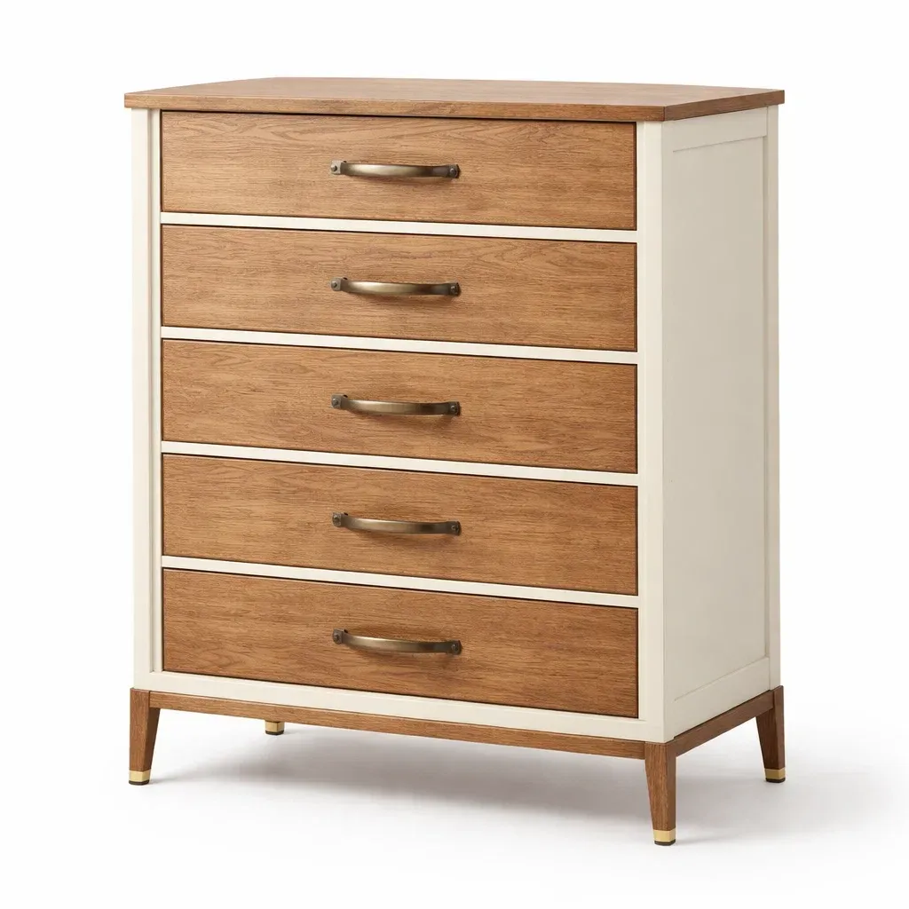 Cassettiera in mdf beige e quercia con cinque cassetti