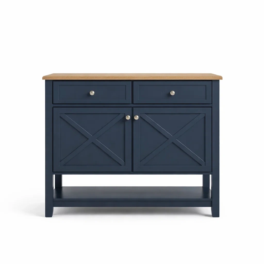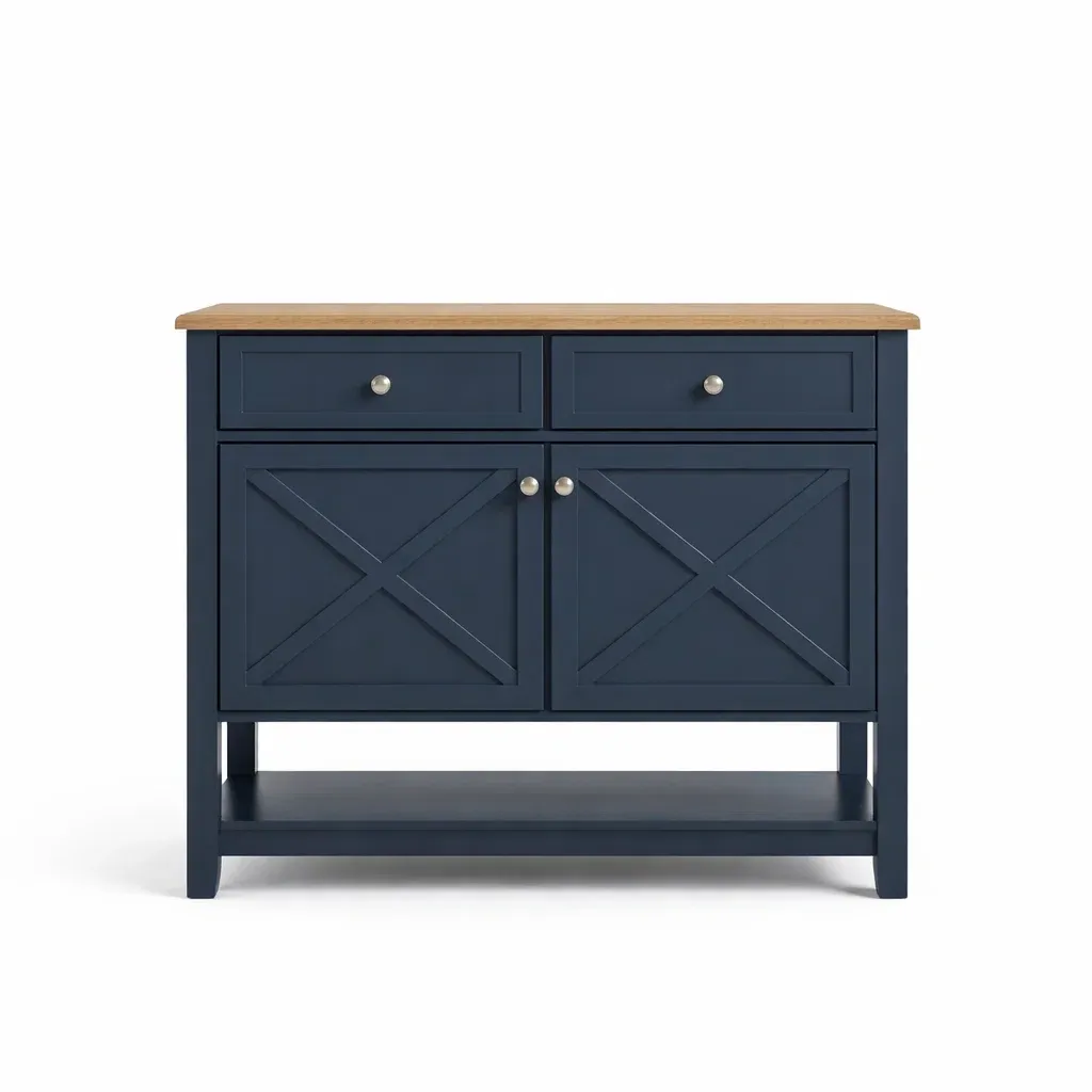 Credenza in legno massello blu con due cassetti e due ante e piano in legno massello