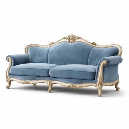 Divano a tre posti in velluto blu con struttura dorata
